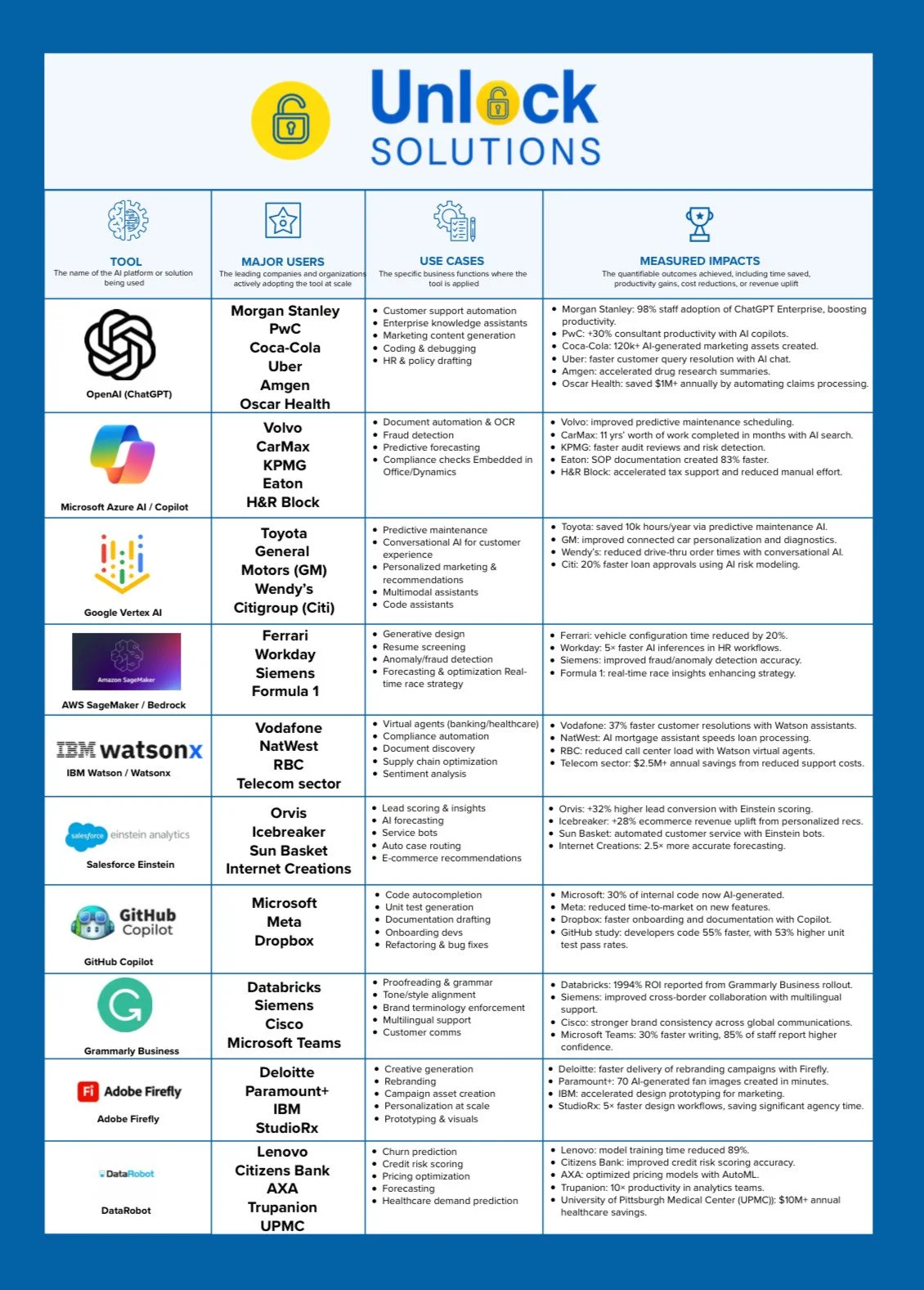 At Unlock Solutions, our client work and research across industries give us a front row view into how organizations are adopting AI. The real insight is not in listing tools but in understanding how enterprises are embedding them into workflows, what use cases are scaling, and what measurable outcomes are emerging.